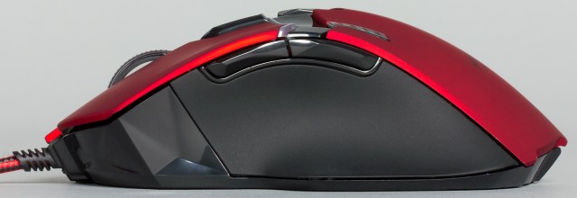 Кстати о боках. На левом боку расположилась кнопка снайпера, которая при нажатии и удержании снижает разрешение оптического сенсора мышки до минимальной величины в 250 DPI. После освобождения кнопки разрешение возвращается к текущей величине выбранного профиля. На правом же боку мыши находится кнопка по пошаговому понижению величины разрешения оптического сенсора с шагом в 250 DPI за одно нажатие. Таким образом, пользователь может тонко настроить мышку под себя и текущую ситуацию. Левый и правый бок мыши сделаны из прорезиненного пластика, окрашенного в черный цвет.