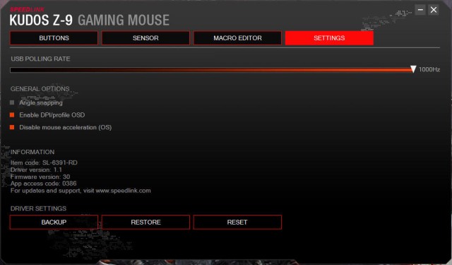 В разделе Settings можно изменить частоту опроса порта USB, включить предсказание положения курсора (angle snapping), отключить OSD и аппаратное ускорение средствами ОС, а также сохранить свои настройки или загрузить их из файла.