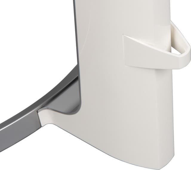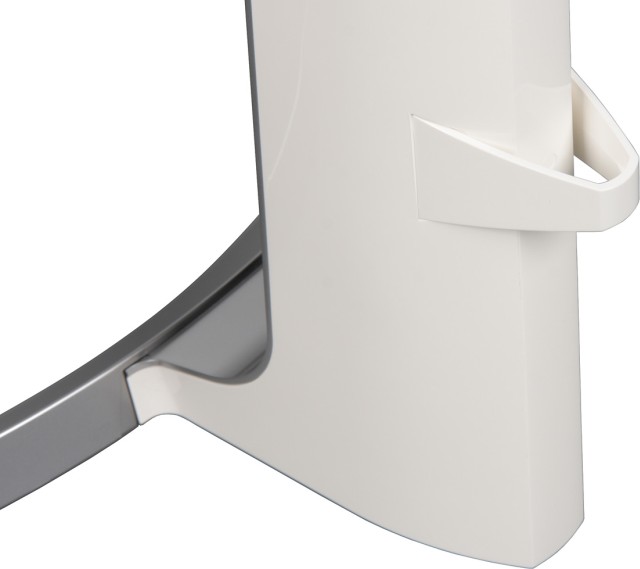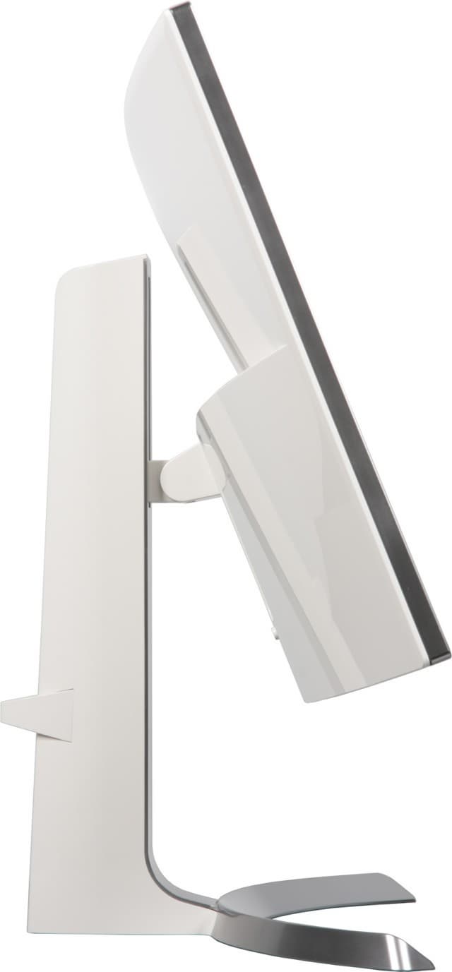 Кожух основания и фронтальная часть кожуха стойки имеют серебристое покрытие, а задняя часть кожуха стойки — белая, зеркально-гладкая, как и задняя панель блока экрана. Кабели, идущие от разъёмов монитора, можно прижать к стойке входящей в комплект поставки скобой из пластика.