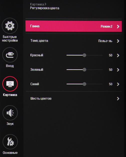 Есть функция улучшения изображения с низким разрешением Super Resolution+. В списке выбирается профиль гамма-коррекции, а цветовой баланс корректируется выбором одного из трёх профилей цветовой температуры или ручной регулировкой интенсивности трёх цветов, а также оттенка и насыщенности шести цветов.