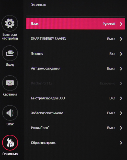 Для USB-выходов заявлена поддержка быстрой зарядки. Какой поддерживается стандарт — не указано, но так как маркировка портов обещает до 1,5 А при 5 В, видимо, это Battery Charging v1.2. В меню можно выбрать, включать ли режим быстрой зарядки и следует ли подавать питание на USB-концентратор, когда монитор переходит в режим ожидания.