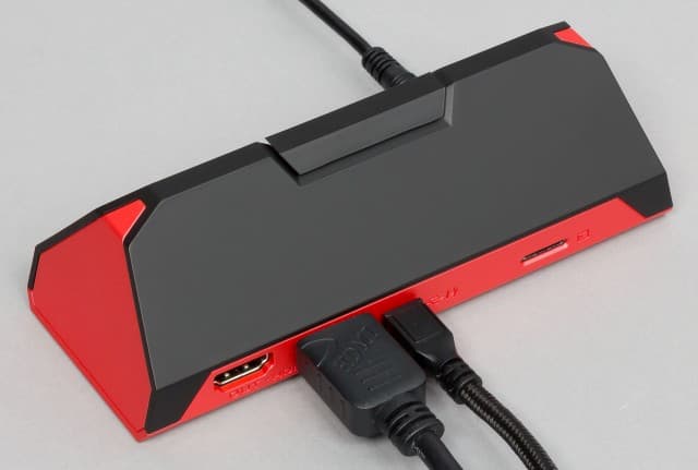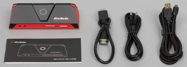 Под крышкой на специальной вставке разместили карту захвата, под ней в отсеках находятся кабель HDMI, кабель USB-microUSB и аналоговый аудиокабель. Первый не производит хорошего впечатления и имеет длину 40 см. Зато кабель USB великолепен — 180 сантиметров толстого провода в тканевой оплетке смотрятся очень солидно. Аудиокабель имеет четырёхконтактные мини-джеки 3,5 мм, что позволяет обеспечить поддержку микрофонов на гарнитурах. Его длина также составляет 180 см.