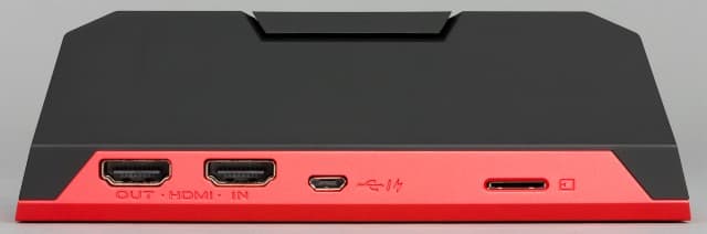 С противоположной стороны корпуса установлены вход и выход HDMI, порт microUSB для подключения к компьютеру, слот для карт памяти формата microSDHC. Заметим, что карта полностью входит в него, так что во время транспортировки мешать не будет. Обратим внимание, что «проходное» подключение по HDMI работает только при наличии питания у устройства. Кроме того, соединение кратковременно прерывается при переключении режима работы. Аналогичное замечание касается и сквозного подключения гарнитуры. Устройство захвата не умеет переключать режим записи (в частности разрешение) во время работы. Так что если вы на компьютере изменили настройки в игре, то видео не будет записано.