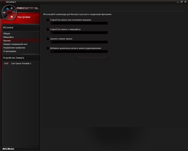 RECentral 3 имеет три режима, которые переключаются через значки в левом верхнем углу, — основной для записи или трансляции, просмотр и публикация записей, настройка параметров. Посмотрим сначала на последний. Здесь вы можете изменить папку для записи файлов, настроить уровень записи для микрофона, выбрать клавиатурные сочетания для основных операций (начало/окончание видеозаписи, активация микрофона, запись скриншота, добавление метки времени в запись), добавить данные аккаунтов для Facebook, Twitter, YouTube, отрегулировать импорт/экспорт/редактирование профилей для записи и трансляций.