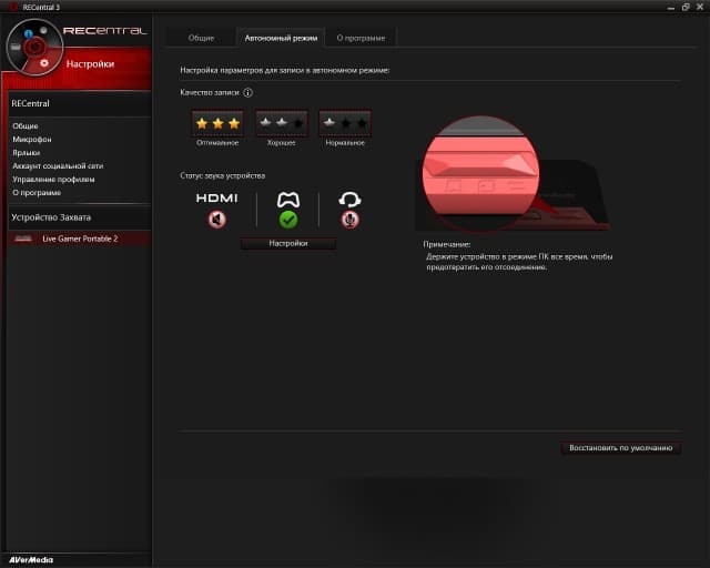 Предусмотрены также настройки для непосредственно самого устройства AverMedia Live Gamer Portable 2. Так, можно отключить действие кнопки на его корпусе при работе с компьютером, выбрать опции для автономной записи (качество видео и уровни звука).