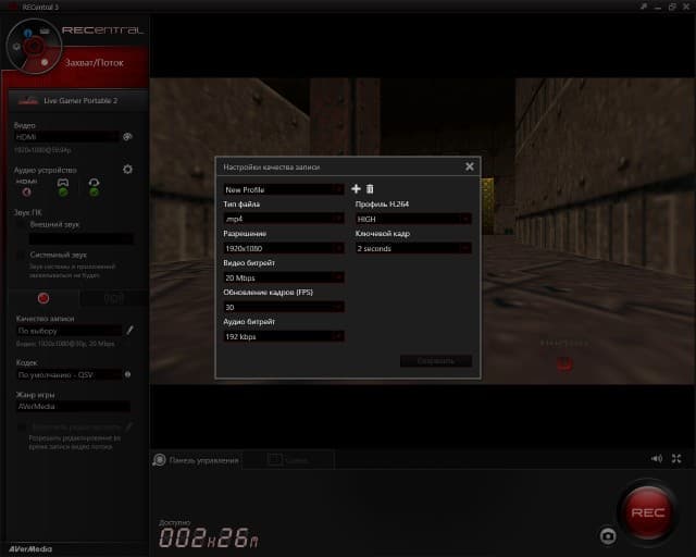 Основной режим работы программы имеет два варианта — для записи видео на жёсткий диск компьютера и для организации прямой трансляции на потоковые сервисы. Некоторые параметры для них одинаковы и могут быть изменены прямо на главном окне программы. В частности это выбор цветового пространства HDMI, микшер для звуковой дорожки (включая звуковую карту компьютера), профиль видео. В последний входят такие традиционные характеристики, как разрешение, частота кадров, битрейты видео и звука, а также профиль кодека H.264 и интервал для ключевых кадров.