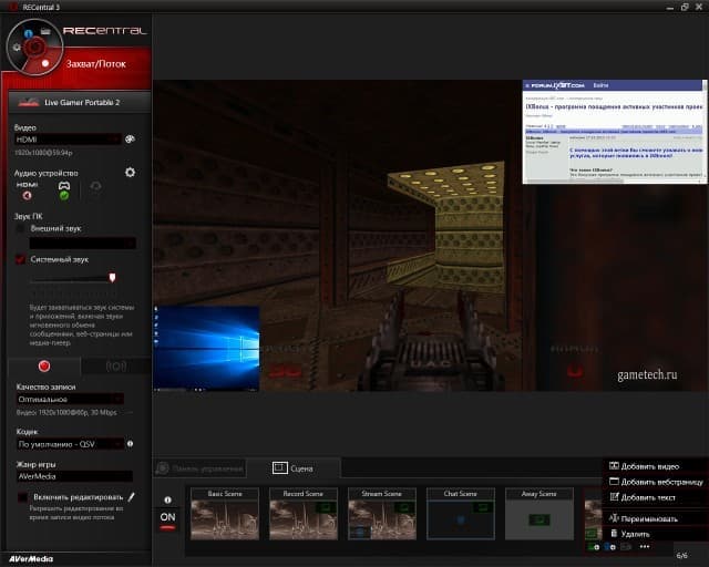 Для профессиональных стримеров могут быть интересны и дополнительные функции по обработке видео перед записью или отправкой на сайт. В дополнение к изменению размеров, повороту и отражениям, в разделе «Сцена» предусмотрено несколько предустановленных шаблонов, но можно создать и свой собственный. Из дополнительных элементов для наложения на видео есть следующие: текст, изображение, видео с web-камеры (режим «картинка в картинке»), web-сайт. Каждый элемент допускает множество настроек, включая положение, размер, цвет и прозрачность. Кроме того, вы можете масштабировать и обрезать исходный видеопоток, так что вполне реально уместить на экране одновременно и полную картинку из игры, и дополнительную информацию.