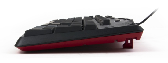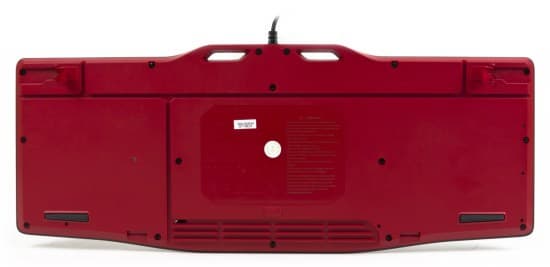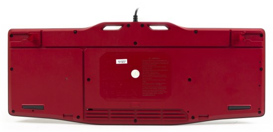 Нижняя часть клавиатуры изготовлена из красного пластика. На дне имеются пазы для кабеля, а также пара хрупких на вид ножек.
