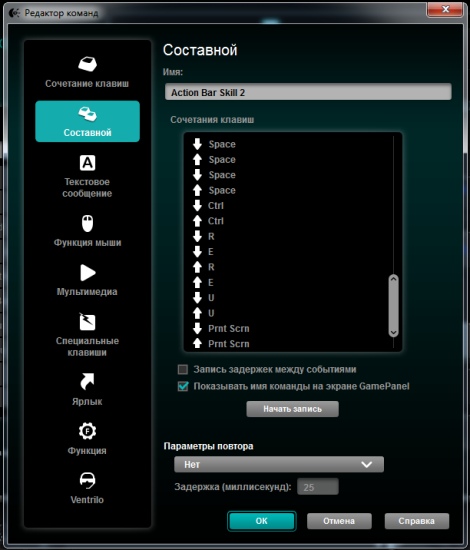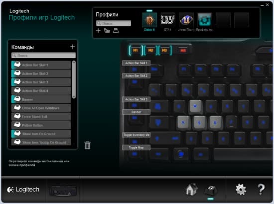 Каждый профиль содержит набор команд, которые можно перетаскивать на шесть G-клавиш в трех режимах. Итого — 18 макроклавиш. Помимо стандартных команд, на каждую кнопку можно назначить сочетание клавиш, записанный макрос, команды мыши или запуск приложения.