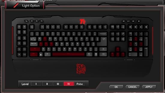 Кроме того, на макрос-клавиши можно назначить запуск программ: для этого надо просто выбрать исполнительный файл. Четвертая кнопка в меню Key Assignment возвращает клавише ее исходную функцию. Система Instant Shift, которой в пресс-релизах было уделено повышенное внимание, заключается в следующем: пользователь может настроить переключение на любую из трех раскладок макросов при зажатых клавишах Ctrl, Alt, Shift.Перейдем к настройке подсветки, которая также осуществляется через GUI. Можно регулировать уровень освещения каждой из трех областей, а также включить/отключить подсветку значка Tt.