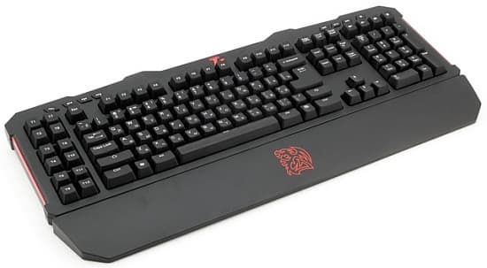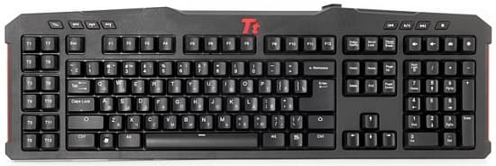 Клавиатура выполнена из черного матового пластика. Красным выделяется логотип Tt eSPORTS и гладкие вставки по бокам.