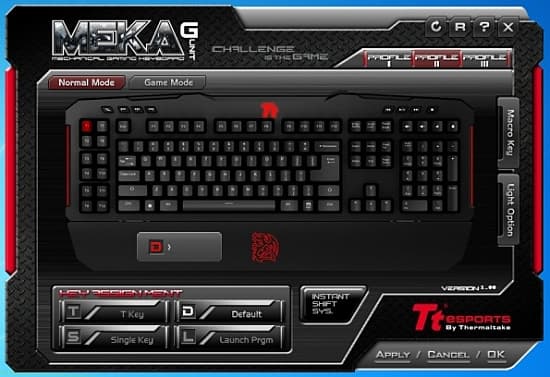 Выглядит интерфейс Meka G-Unit не слишком дружелюбно. Освоение облегчает справка по установке, доступная по клику «?» в правом верхнем углу.Для программирования пользователю доступно не только 12 пронумерованных T-клавиш. В режиме Game можно назначить команды и на 8 любых других клавиш (кроме мультимедийных).Макросы создаются и поддаются точной пошаговой настройке при помощи соответствующей кнопки справа в окне GUI. Осваивая редактор макросов, мы заметили, что, хотя в них можно добавить команды типа «Копировать», «Вставить», «Показать рабочий стол» или «Закрыть окно», в списке появится вовсе не то, что вы выбрали: