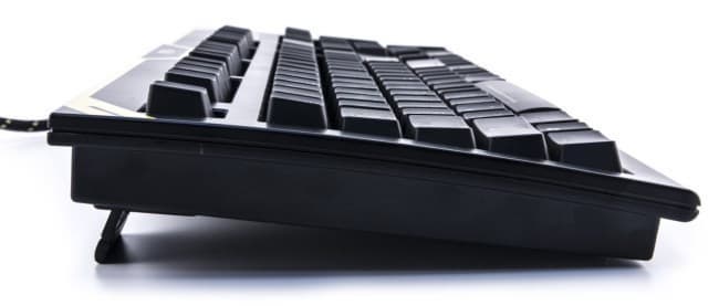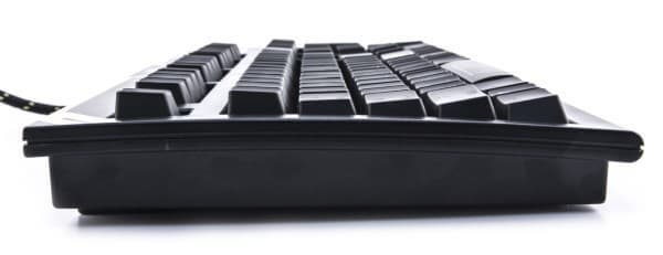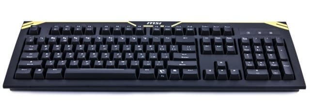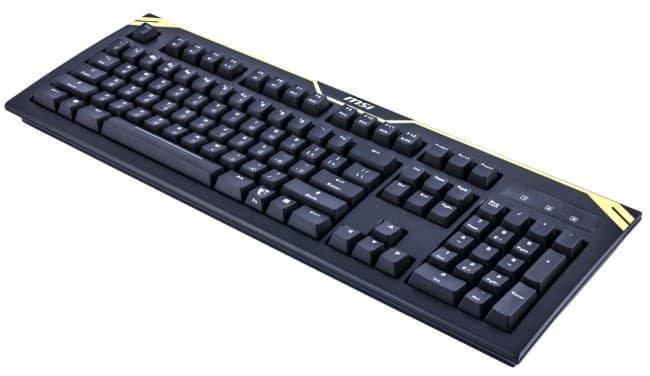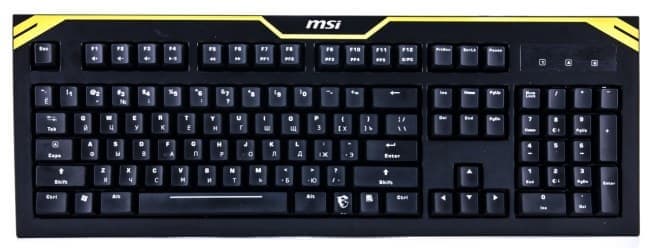 Первая игровая клавиатура MSI имеет внушительную массу — более килограмма. Желтая полоска вдоль верхнего края добавляет строгому черному корпусу футуристичности. Кнопки MSI GK-601 основаны на популярных механизмах Cherry MX Red и имеют покрытие софт-тач. Весьма неудачная комбинация, которую мы уже встречали в клавиатуре другого известного производителя — Gigabyte Aivia Osmium. Сами кнопки утоплены в массивный корпус.