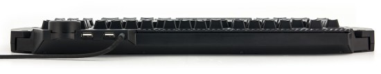 Приподнять клавиатуру можно при помощи двух пар ножек. Небольшую несъемную подставку для запястий, как и боковые «крылья», украшают пластмассовые шестигранные головки винтов. На тыльной стороне расположена пара USB-портов. Для их нормальной работы клавиатуру следует подсоединить к двум USB-портам ПК.