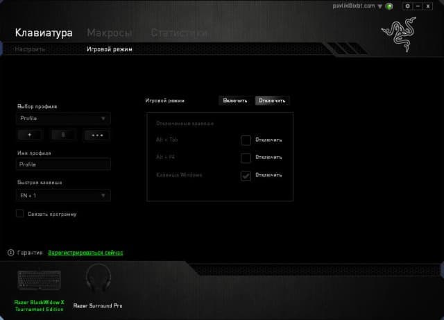 В разделе под названием «Клавиатура» есть два подраздела «Настроить» и «Игровой режим». В первом подразделе можно определить значения всех клавиш, во втором — настроить, какие горячие клавиши будут выключаться во время игрового режима.