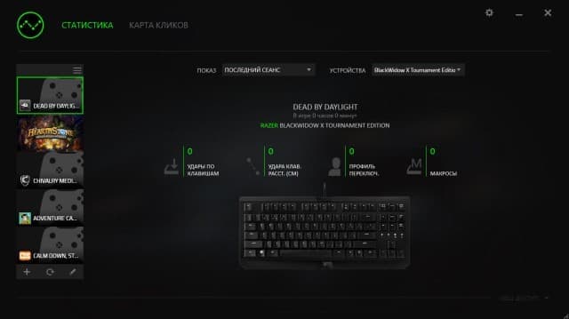 В разделе «Статистика» отображаются все собранные Synapse данные по установленным на вашем ПК играм, которые были распознаны. Количество нажатий на определённые клавиши, средняя частота нажатий в минуту и другая жизненно важная информация.