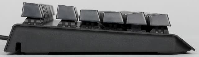 Если перевернуть клавиатуру и посмотреть на её основание, то легко заметить пять прорезиненных пластин, обеспечивающих хорошее сцепление с поверхностью, и две откидывающиеся упорные ножки, позволяющие приподнять клавиатуру над столом и изменить угол наклона на 10-15 градусов.
