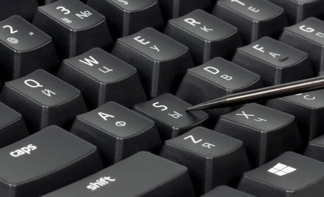 Клавиатура имеет стандартный набор клавиш. У символов латиницы шрифт большего размера, чем у кириллицы. Все символы выгравированы со смещением к верхней части колпачков клавиш, при этом символы кириллицы располагаются строго под символами латиницы. Довольно необычное решение. В целом символы хорошо считываются при любом освещении, особенно если привыкнуть к их расположению на клавишах.