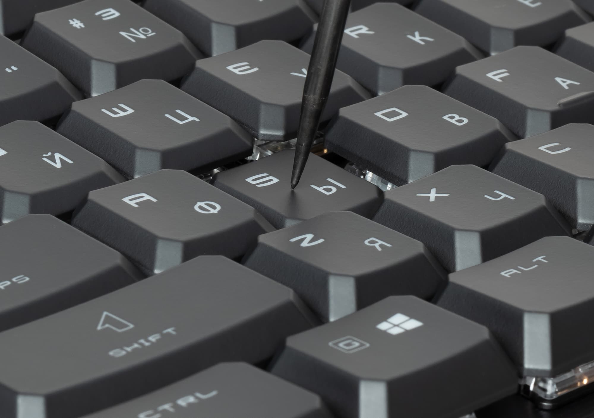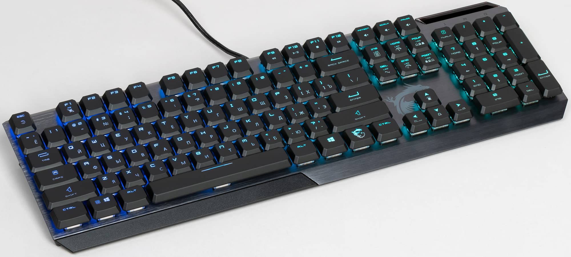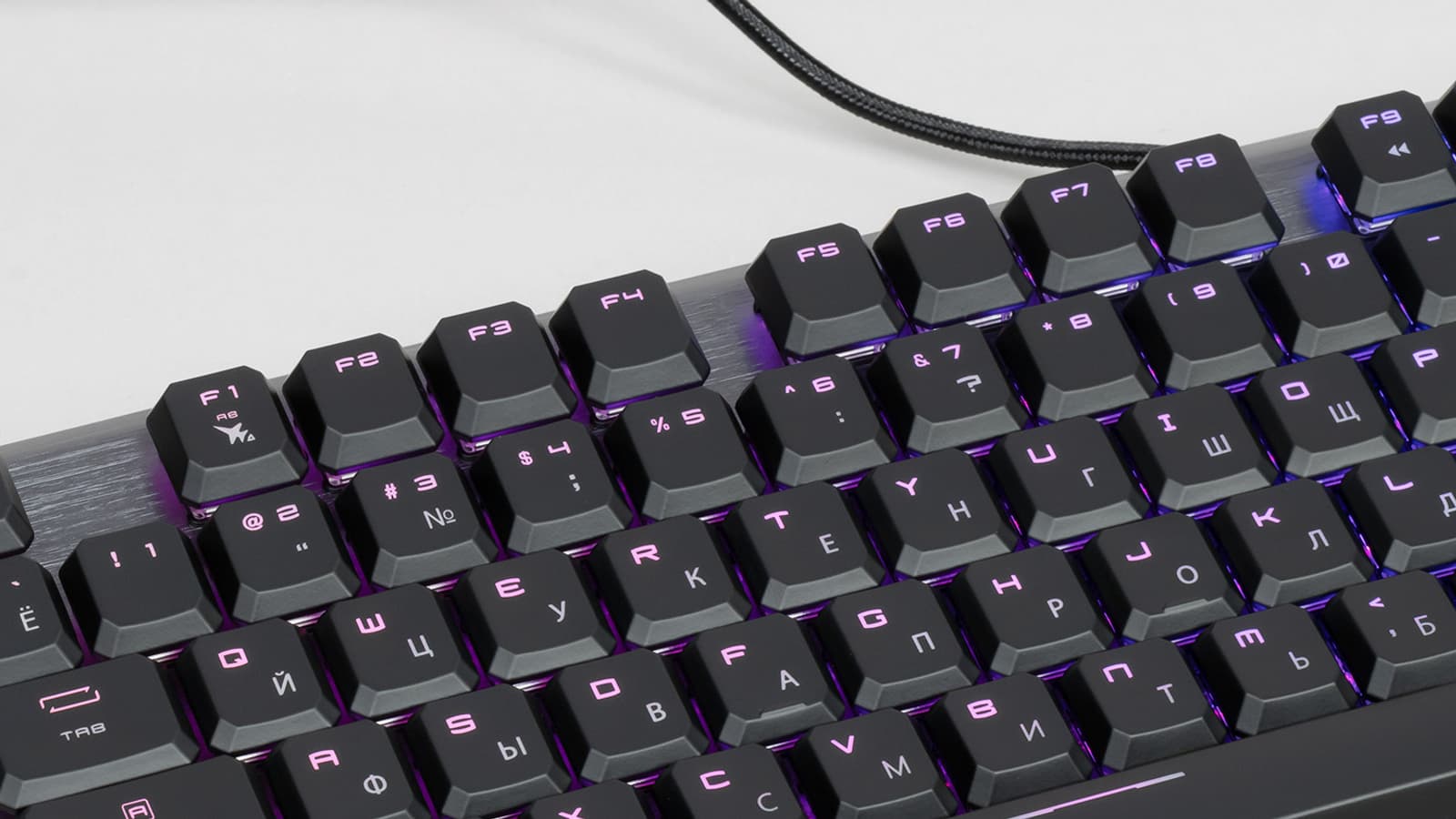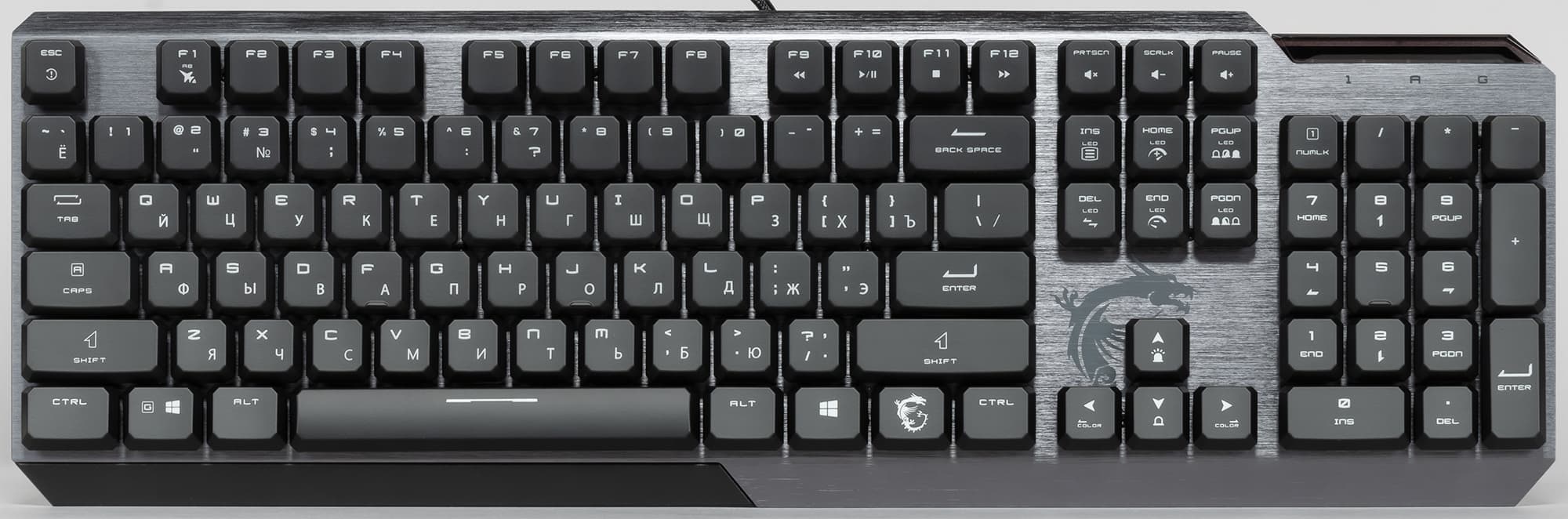 Шрифт для латиницы выбран отличным от начертания кириллических символов. Светодиоды под колпачками клавиш смещены к верхней части, из-за чего символы кириллицы освещаются хуже.