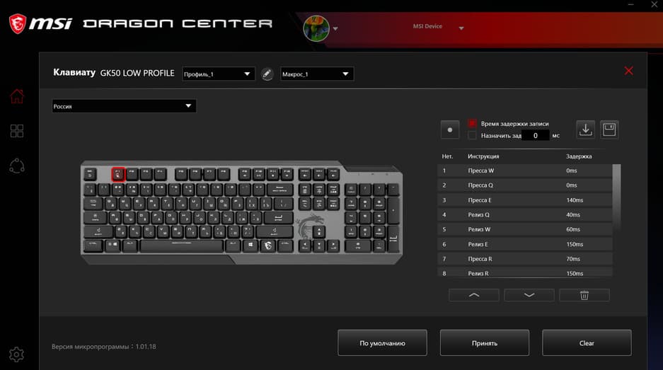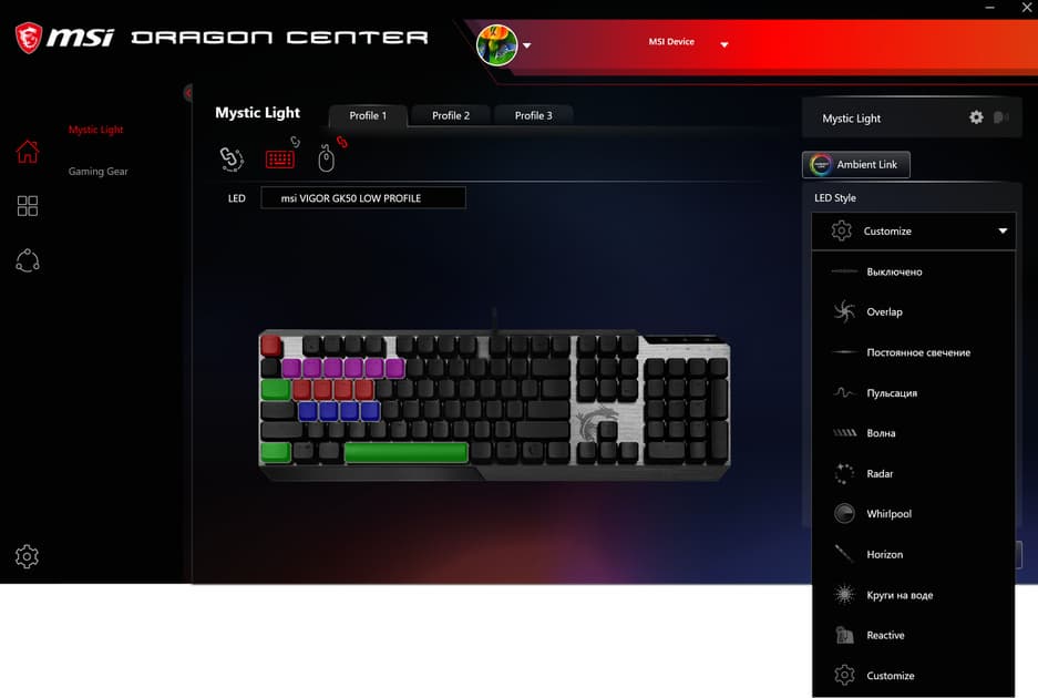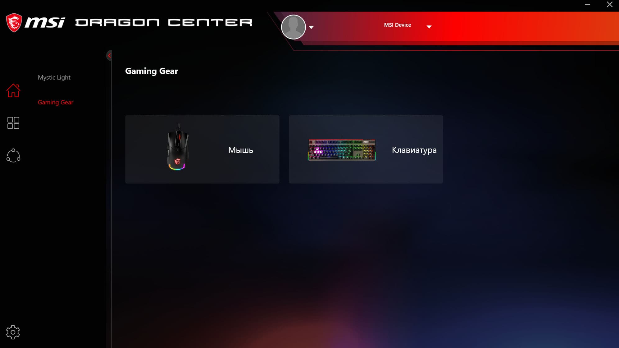 Интерфейс приложения не полностью переведён на русский язык, так что навигация по меню может быть затруднена. В основной вкладке с домиком есть два раздела – Mystic Light и Gaming Gear. В первой осуществляется настройка подсветки всех совместимых устройств, во второй – запись, настройка и назначение макросов.