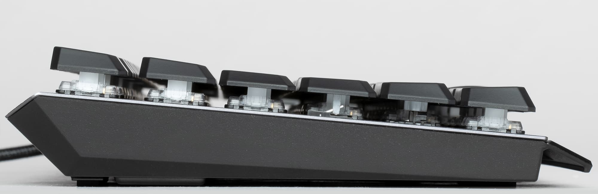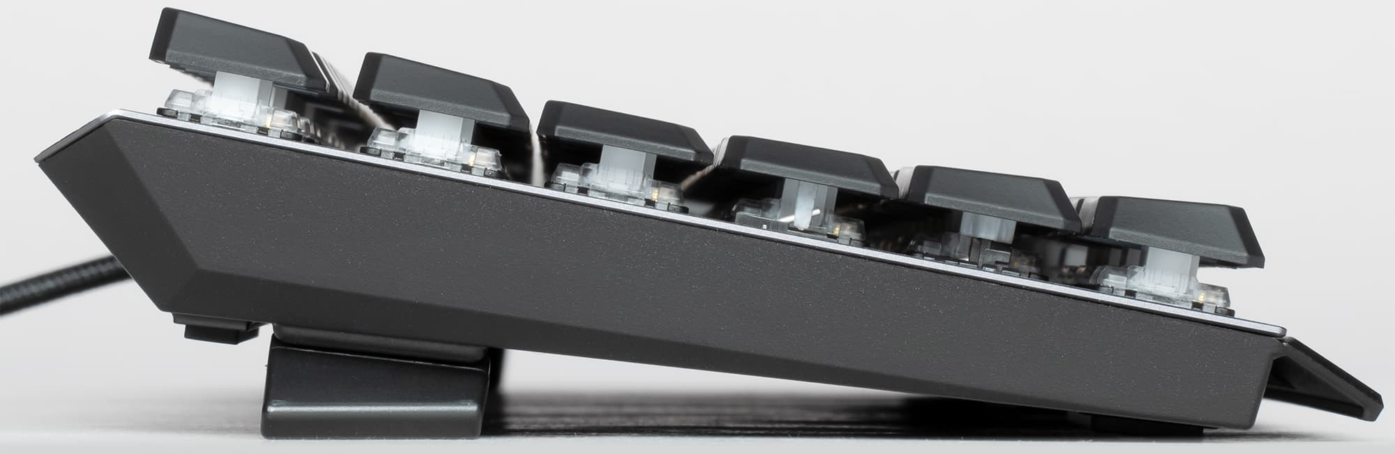 Мы опробовали игровую клавиатуру в следующих играх: Path of Exile, Mordhau, Warhammer: Vermintide 2, Dead by Daylight, Tom Clancy’s RainbowSix Siege, Escape from Tarkov и Payday 2. В начале тестирования мы настороженно отнеслись к низкопрофильным переключателям Kailh с полным ходом в 3 мм и ходом до срабатывания в 1,5 мм. Более короткий ход переключателей ощущается сразу же, потому что мы используем обычную клавиатуру с полным ходом 4 мм и ходом до срабатывания в 2 мм.