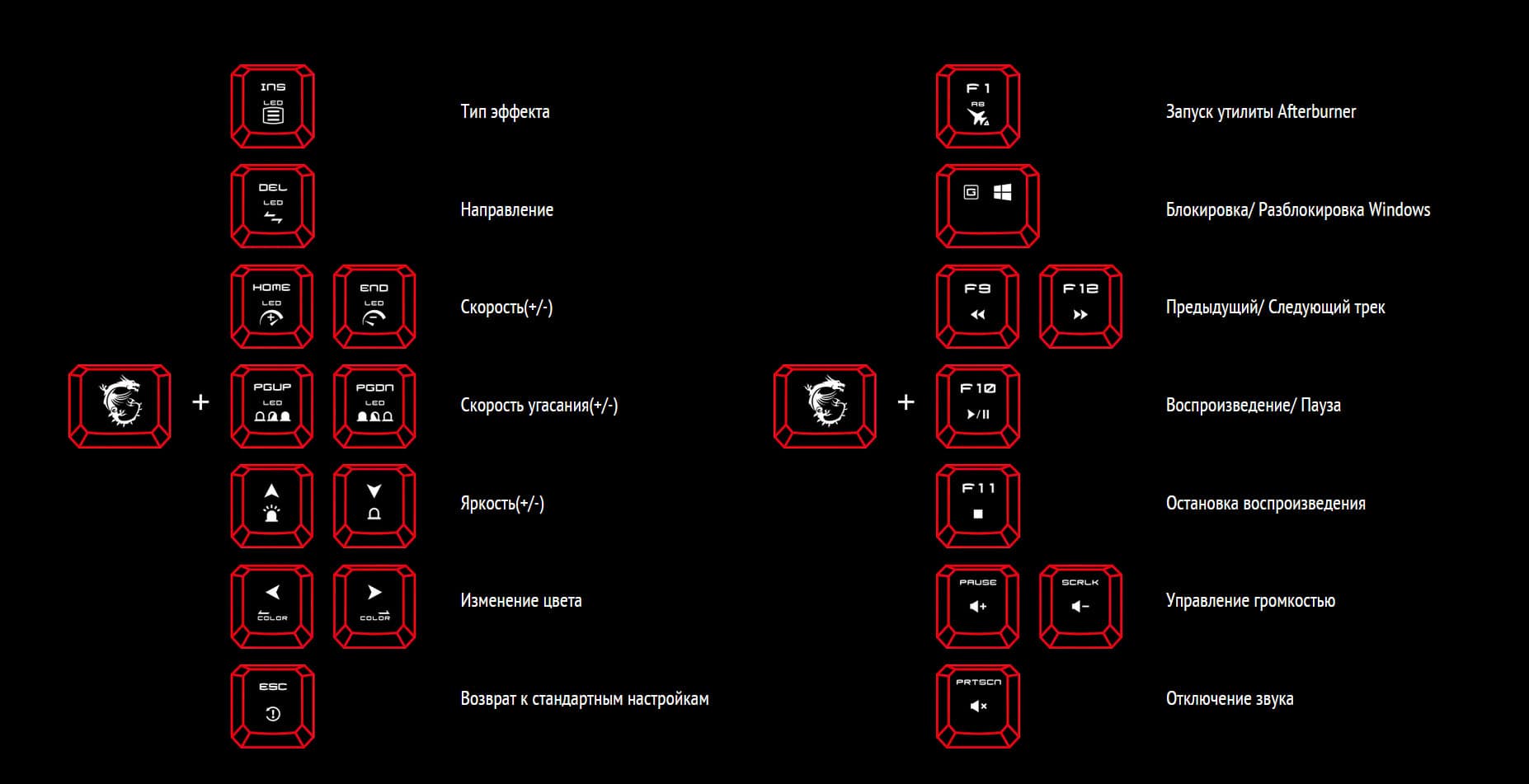 Ряд клавиш Esc, F1 – F12 расположен с небольшим отступом от главной панели клавиш, что позволяет при необходимости легко до дотянуться до любой их них, не отрывая ладони от стола. Как можно было заметить по иллюстрациям, на некоторые клавиши нанесены дополнительные значки, которые подсказывают, что будет, если их нажать в комбинации с клавишей модификатором с изображением боевого дракона на ней. Обычно такие клавиши обозначаются символами Fn. Список основных горячих клавиш приведён на картинке ниже.