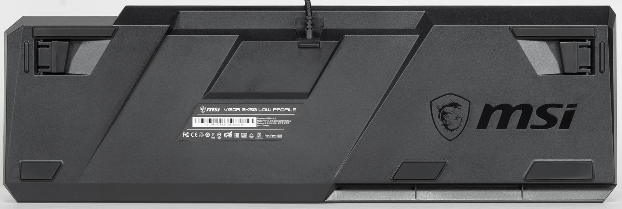 На днище клавиатуры предусмотрены две откидные ножки, позволяющие приподнять переднюю часть устройства относительно поверхности стола примерно на 10–15 градусов. Три опорные ножки в виде прорезиненных накладок предотвращают случайное скольжение клавиатуры по столу.