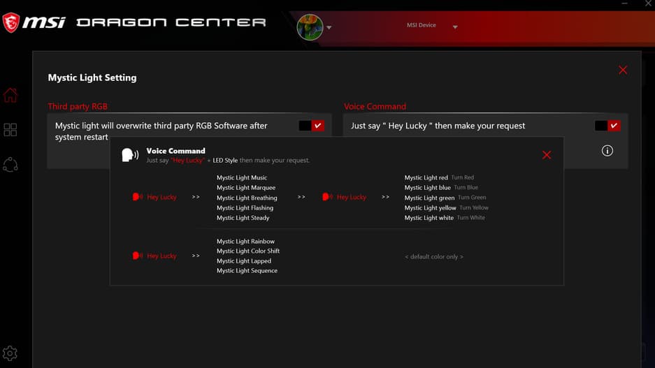 Выше этой вкладки есть шестерёнка, нажав на которую мы сможем активировать голосовой режим управления, в котором приложение может распознавать ваши команды через микрофон и активировать выбранный режим подсветки.