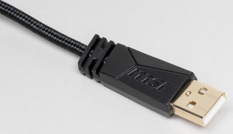 Интерфейсный кабель защищён текстильной оплёткой. На штекере из чёрного пластика присутствует аббревиатура MSI.