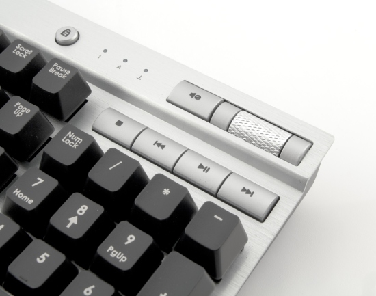 Перейдем к «обвесу». Обе клавиатуры имеют мультимедийный блок из четырех кнопок. Чтобы дотянуться до них, запястье от стола придется оторвать. Выше расположена кнопка отключения звука и удобное широкое колесико для его регулирования. Левее — светящиеся белым индикаторы режимов; еще левее — кнопка блокировки клавиш Windows.