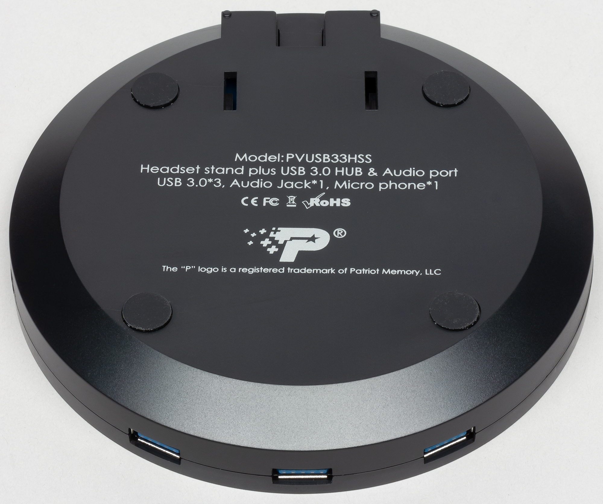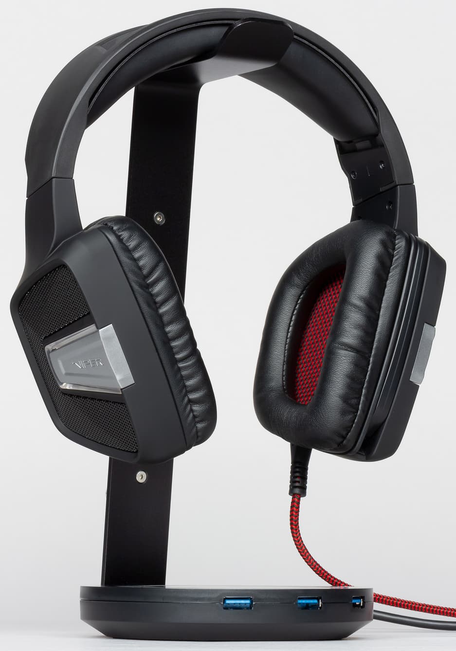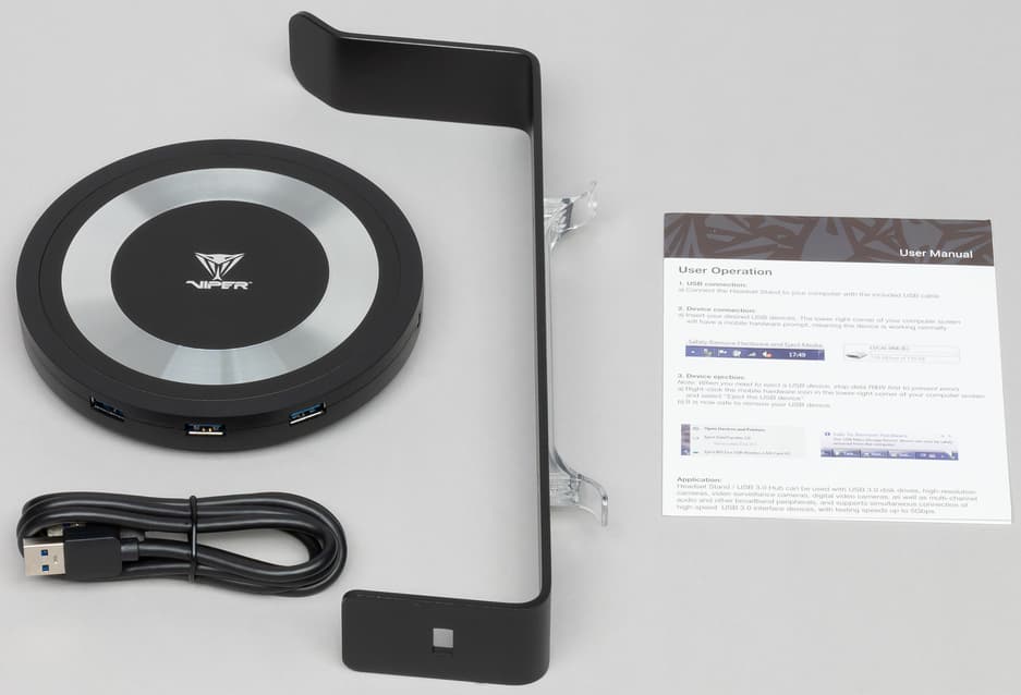 Patriot Viper Headset Stand подключается к компьютеру по USB и сама имеет три разъёма USB 3.0 (то есть служит хабом), 3.5-миллиметровых разъём под наушники и такой же микрофонный вход, а также кнопку on/off.