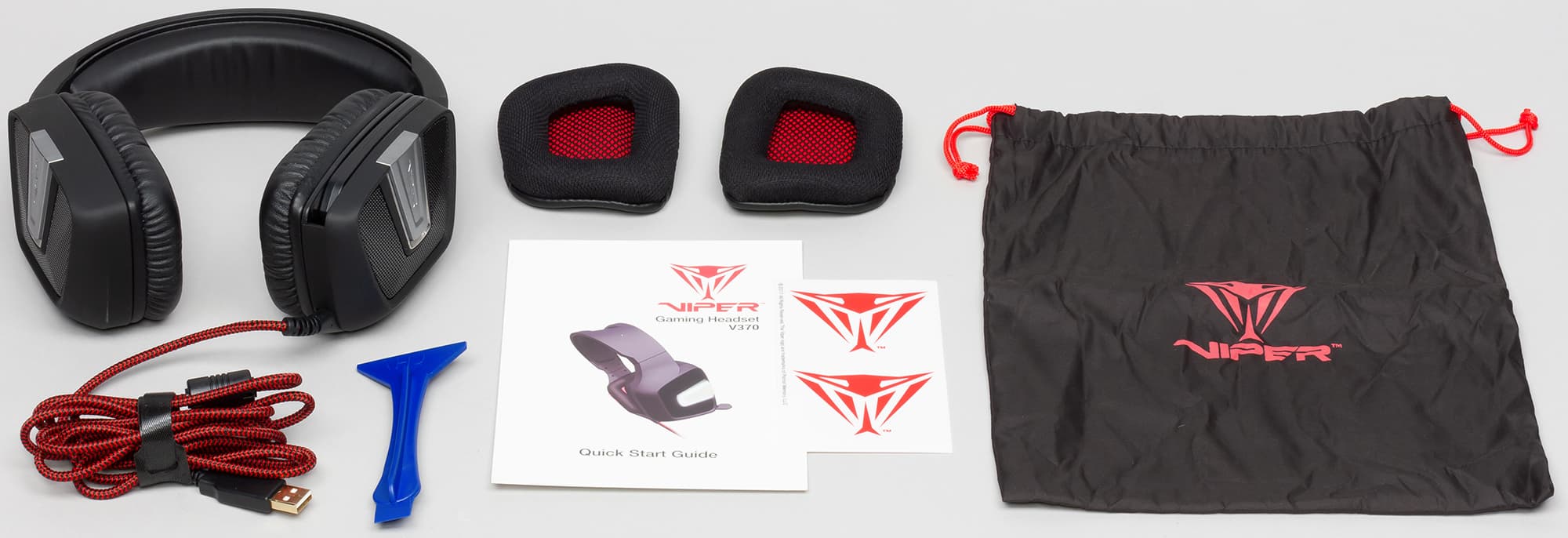 Гарнитура поставляется в коробке из плотного картона с пластиковым холдером внутри. В комплекте есть чехол для хранения, дополнительные тканевые амбушюры, пластиковое приспособление для их монтажа, карточка-инструкция и пара наклеек.