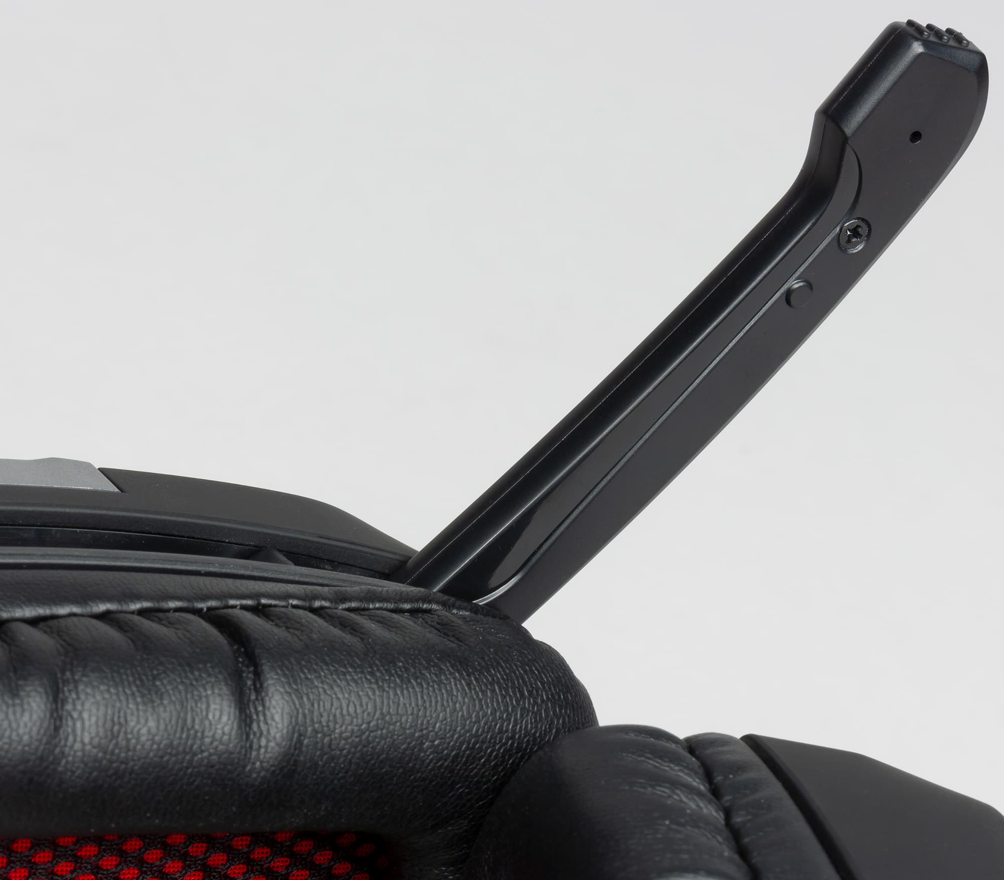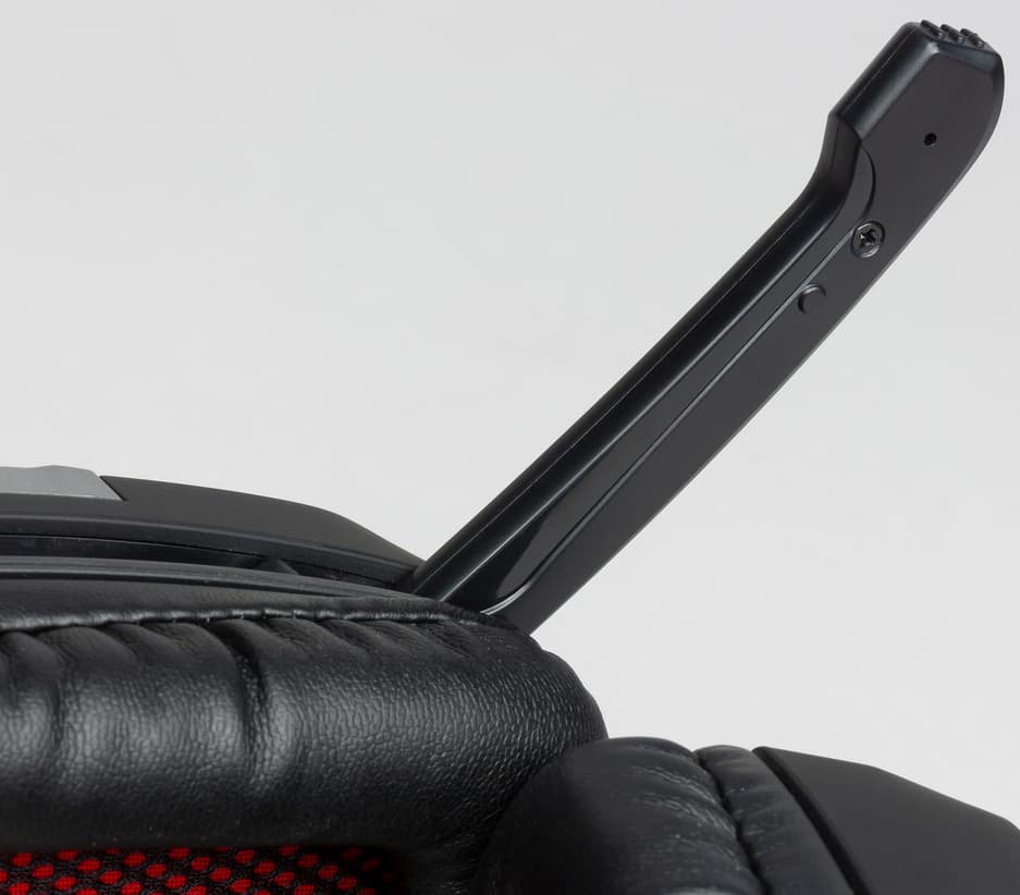 Дужка микрофона расположена в левой чашке и имеет дискретный механизм, позволяющий при необходимости её опускать и убирать обратно. Она сделана из твёрдого пластика, поэтому отрегулировать расстояние от микрофона до рта не получится.