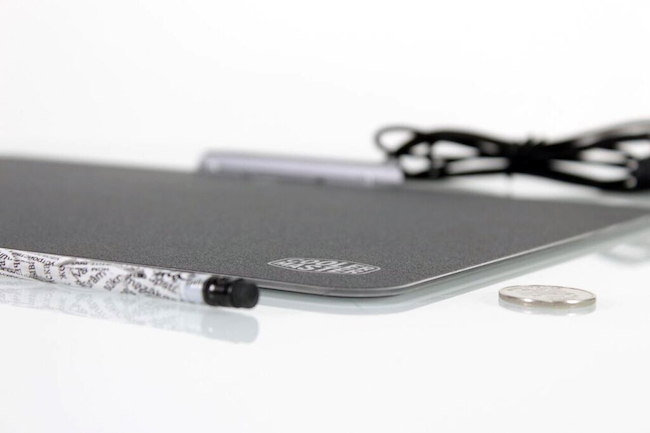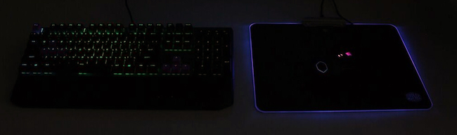 В правом нижнем углу поверхности коврика расположен полупрозрачный логотип Cooler Master. Обрамление коврика сделано из полупрозрачного пластика, который пропускает свет от подсветки, которая находится где-то в недрах устройства.