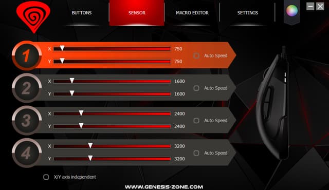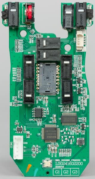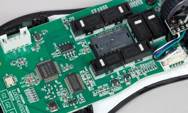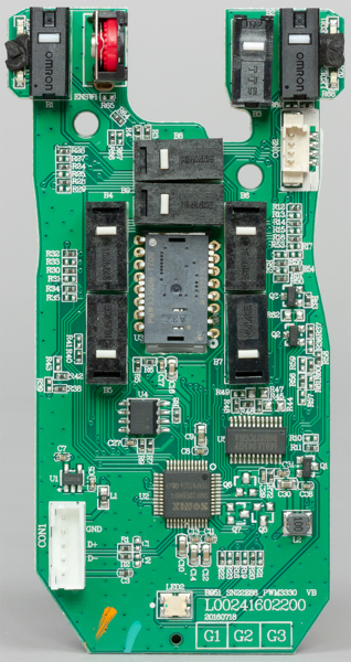 Здесь мы видим оптический сенсор Pixart PMW3330. По спецификации производителя сенсора, его максимальное разрешение составляет 7200 dpi. Однако Genesis заявляет о потолке в 10200 dpi для своего устройства. Очевидно, что подобное значение достигается не «железом», а программным обеспечением, то есть путём интерполяции, что пагубно сказывается на точности устройства.