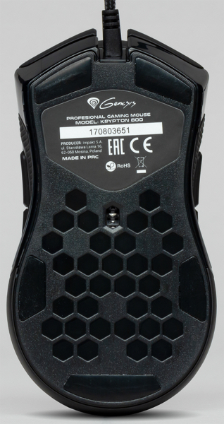 Нижняя панель манипулятора выполнена из чёрного текстурированного пластика. На ней расположены пять панелей из эластичного скользящего материала и отверстие для оптического сенсора. В верхней части панели находится информация о модели и производителе, а также серийный номер устройства.