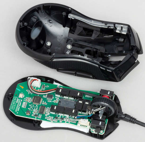 Подсветка колеса прокрутки осуществляется при помощи отдельного светодиода, встроенного в небольшую плату, крепящуюся на винт.