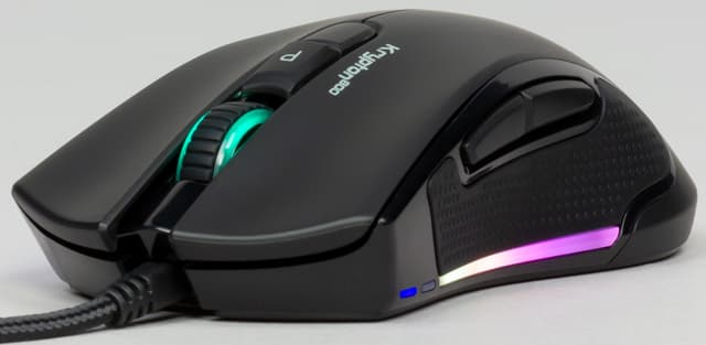 Между левой и правой кнопками манипулятора находится стандартного размера колесо прокрутки с резиновой ребристой накладкой, выступающее над корпусом на пару миллиметров. Колесо подсвечивается, но его подсветка несёт чисто функциональную нагрузку — цвет зависит от выбранного профиля мыши.