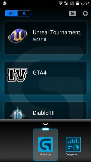 Приложение состоит из нескольких экранов, переключение между которыми осуществляется через выдвижное меню снизу. На первом экране собраны профили игр, имеющиеся в десктопном приложении. По клику их можно запустить.