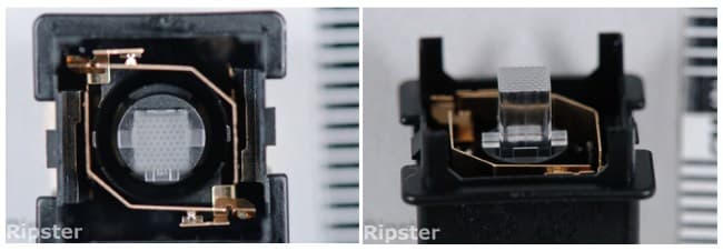 Как известно, у Cherry MX имеются проблемы с освещением клавиш, что особенно заметно на двуязычных устройствах, где английские буквы обычно видны четко, а локальный алфавит — уже нет. Конструкция клавиш Romer-G предусматривает размещение линзы светодиода точно посередине — прозрачный кубик на иллюстрациях. Таким образом, подсветка равномерно распределяется по всей площади и производит отличное впечатление — ничего подобного в решениях на Cherry MX не было.