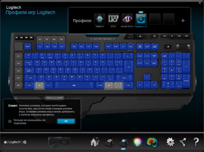 Фирменная утилита Logitech, о которой мы уже не раз рассказывали, славится своим удобством и функциональностью. Остановимся на тех возможностях, которые она предоставляет обладателям G910 Orion Spark.