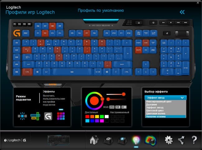 Утилита Logitech активно использует новый тип подсветки, предлагая пользователю множество разных режимов. Разумеется, можно установить любой цвет для каждой клавиши (кроме переключения макрорежимов и мультимедийного блока). «Эффект звезд» будет случайным образом подсвечивать разные комбинации клавиш на «небе» выбранного цвета. Суть «цветового цикла» и «цветовой волны» понятна из названия — это самые яркие деморежимы. «Нажатие клавиш» подсвечивает кнопки, которые вы нажали на клавиатуре, в течение устанавливаемого промежутка времени. Можно подсветить только клавиши, активные в данном профиле, или отдельные зоны.