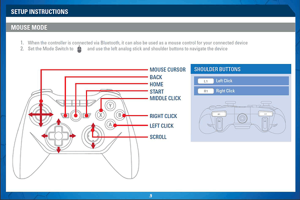 Режим Mouse (см. иллюстрацию выше) не требует установки сторонних программ, для работы со штатным ПО нужно переключить геймпад в режим PC Mode (поддерживается и GameSmart, но не всегда корректно, поэтому при подключении к PC этот режим не рекомендуется).