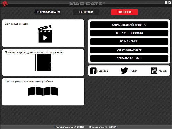В разделе поддержки представлены ссылки на обучающее видео, руководство по программированию и электронную версию краткого руководства по подключению. Здесь же доступны ссылки на загрузку драйверов и ПО, профилей (отсутствующих для Mad Catz C.T.R.L.R.), а также базу вопросов и ответов и форму для обратной связи.