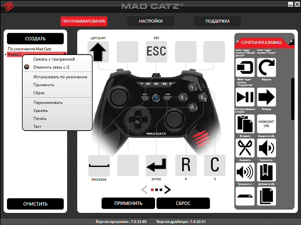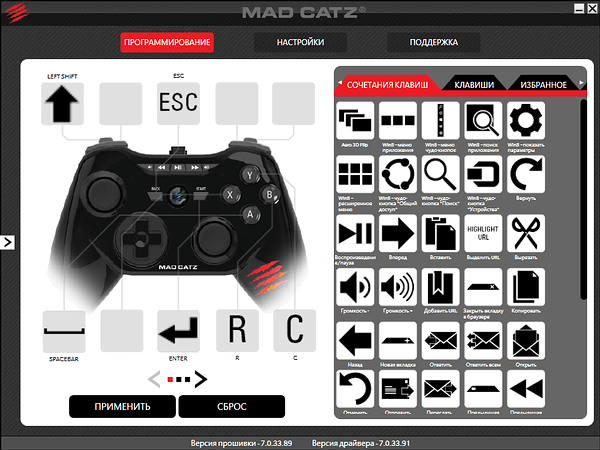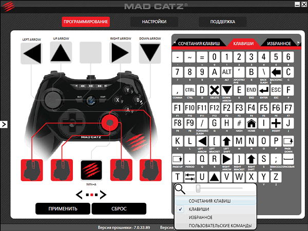 Вкладка «Программирование» позволяет настроить не только кнопки, но и аналоговые стики. Для обеих групп настраиваемых кнопок доступны стандартные сочетания (особенно много внимания уделено поддержке Windows 8) и отдельные кнопки, наглядно представленные подписанными пиктограммами.