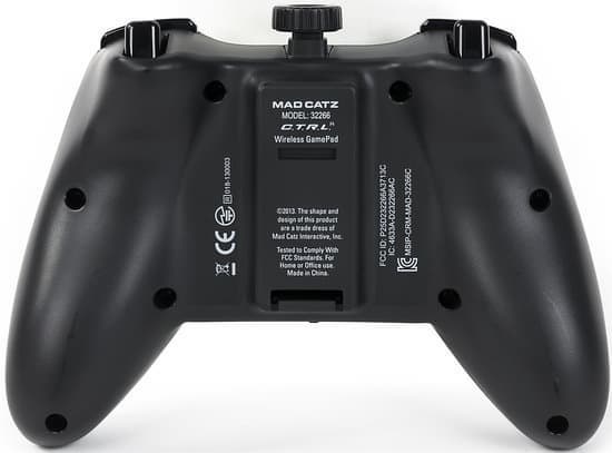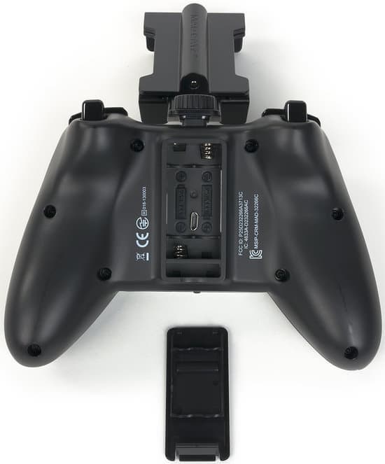 Работает Mad Catz C.T.R.L.R. от двух батареек типоразмера AAA, входящих в комплект поставки. В связи с этим габариты батарейного отсека существенно скромнее, нежели у геймпада от Microsoft.