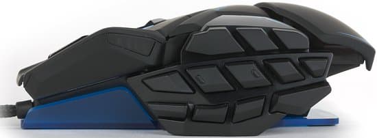 На момент подготовки этого материала Mad Catz M.M.O. TE является единственной мышью в линейке производителя, не имеющей площадки для большого пальца. Левую часть занимает блок из 12 кнопок, разной формы и размеров для удобства распознавания, кнопки, по умолчанию отвечающие за «Вперед» и «Назад» в браузерах, подобно кнопкам «F» и «J» на клавиатурах, имеют небольшие выступы.