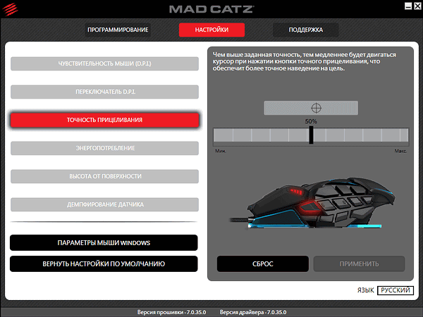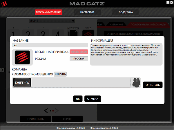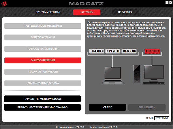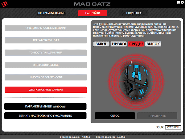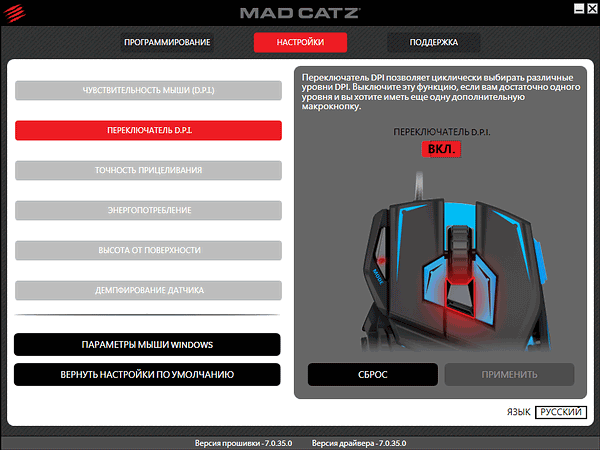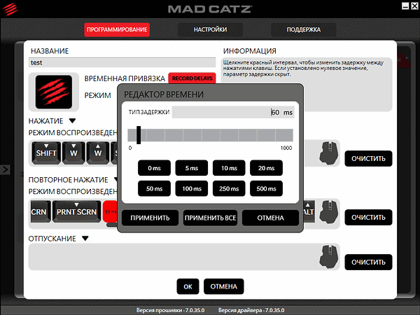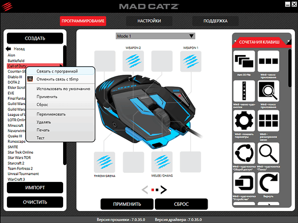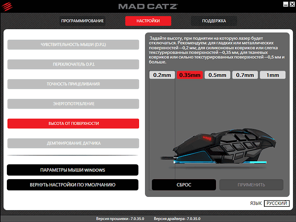 При тестировании использовались драйверы и ПО (в локализованном варианте почему-то называемое «прошивкой» вместо «Software», хотя возможности обновления таковой Mad Catz M.M.O. TE не имеет, мыши этого производителя до сих пор не обзавелись встроенной памятью) версии 7.0.35.0.