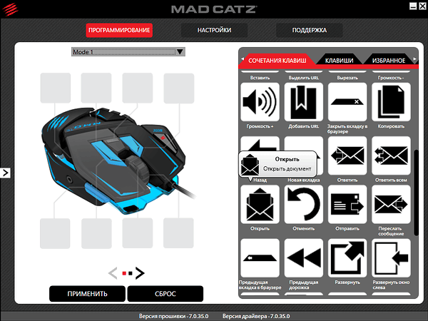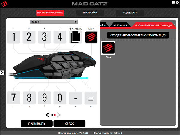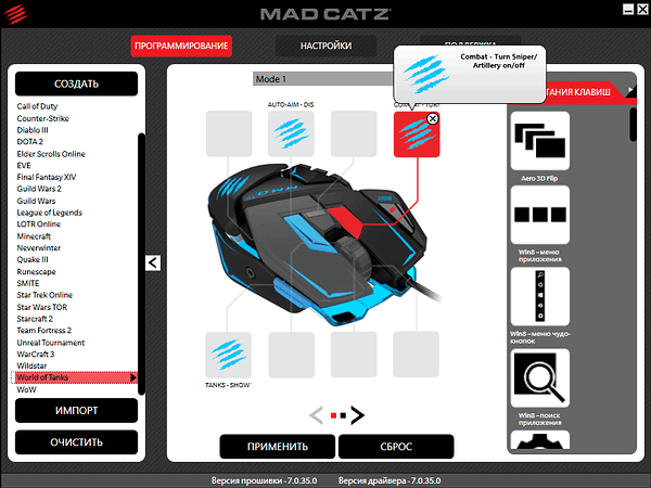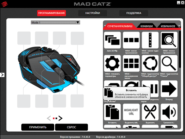 Вкладка «Программирование» позволяет настроить кнопки для каждого из трех профилей, промаркированных как Mode 1, Mode 2 и Mode 3 в этом же разделе. Для обеих групп настраиваемых кнопок доступны стандартные сочетания (особенно много внимания уделено поддержке Windows 8) и отдельные кнопки, наглядно представленные подписанными пиктограммами.
