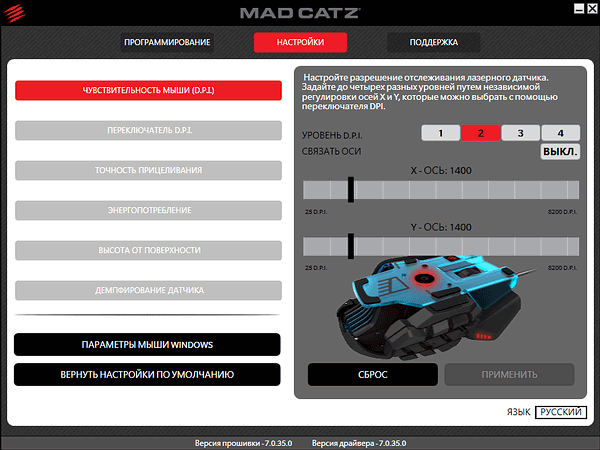 Раздел «Настройки» позволяет настроить чувствительность, выбрав для каждого из четырех общих для всех профилей уровней значения в диапазоне от 25 до 8200 точек на дюйм (DPI) с шагом в 25.